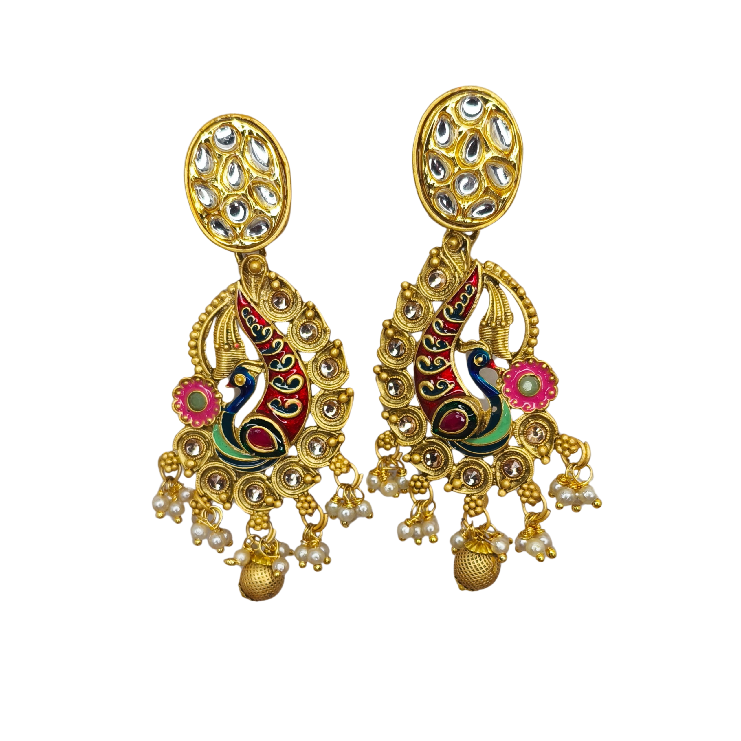 A timeless addition to any bridal or festive jewellery collection, the Heritage Peacock Pearl Drop Jhumkas bring classic beauty and regal charm to every look.