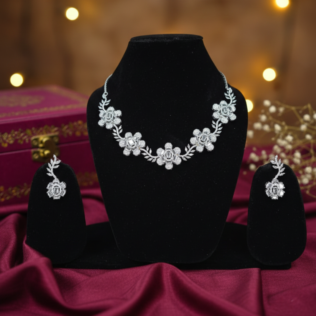 Step into timeless bridal elegance with the Queen’s Garden Diamond Bridal Set, inspired by blooming garden florals. Featuring a delicate floral design adorned with brilliant diamond-look stones, this exquisite set offers a radiant royal sparkle. The finely crafted necklace rests gracefully on the neckline, paired with matching earrings that complete the majestic look. Perfect for weddings, receptions, and grand bridal celebrations, this set beautifully complements lehengas, sarees, and luxurious bridal ensembles, making every bride feel truly royal on her special day.