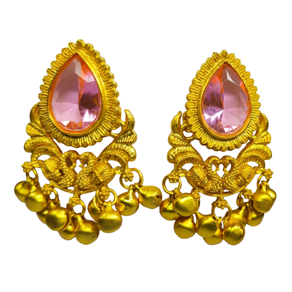 Add a soft yet royal touch to your ethnic look with these elegant Rose Pink Stone Gold Jhumkas. Featuring a beautifully faceted rose pink teardrop stone set in intricate gold finish detailing, these earrings exude feminine charm and traditional grace. The delicate hanging beads enhance their movement and beauty, making them perfect for weddings, festive occasions, and special celebrations. Pair them effortlessly with sarees, lehengas, or ethnic suits for a timeless and graceful look.