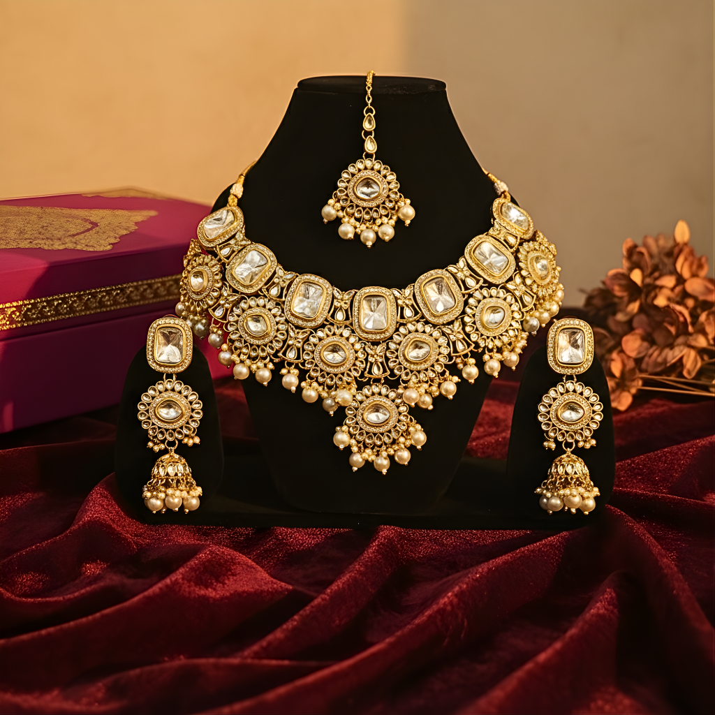 Add regal elegance to your wedding look with the Royal Kundan Pearl Bridal Set, crafted to reflect timeless Indian heritage. This exquisite bridal jewellery set features premium kundan stones set in a rich gold-plated finish, beautifully complemented by graceful pearl drops that add royal charm and movement.